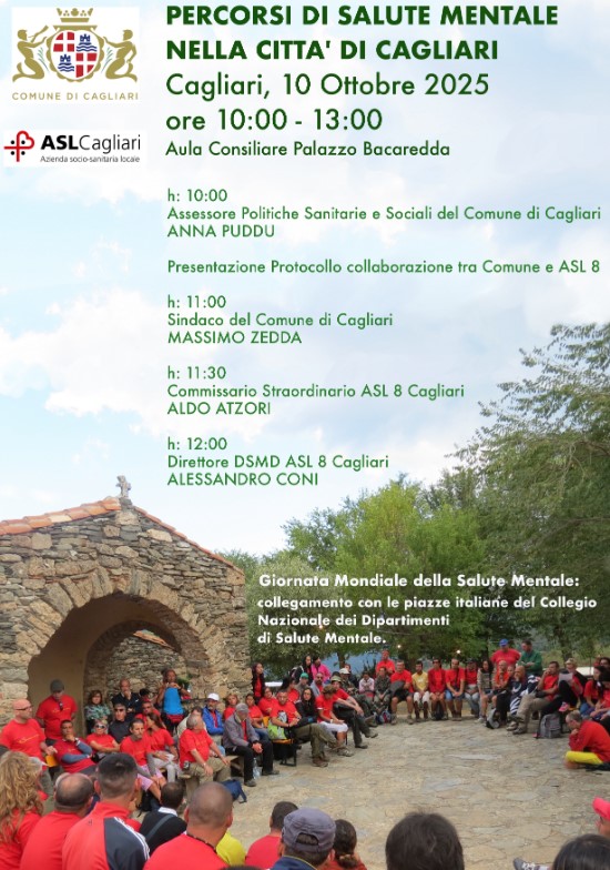 In occasione della Giornata Mondiale della Salute Mentale, il Dipartimento di Salute Mentale e Dipendenze rinnova il proprio impegno nel promuovere la cultura della salute mentale nel proprio territorio. I Centri di Salute Mentale di Quartu Sant’Elena, Senorbi, Assemini, il Servizi di Neuropsichiatria dell’Infanzia e dell’Adolescenza, i Centri Diurni Dipartimentali attiveranno diverse iniziative aperte alla popolazione, alle Istituzioni locali, alle Associazioni di Volontariato. A Cagliari, presso l’Aula Consiliare del Comune, a partire dalle ore 10:00, si svolgerà un incontro pubblico sul tema: “Percorsi di Salute Mentale nella città di Cagliari”, promosso dal Comune e dalla ASL 8 Cagliari nel corso del quale è prevista la firma di un protocollo tra il Sindaco ed il Commissario Straordinario della ASL 8, per attivare percorsi di prossimità reali ed integrati.